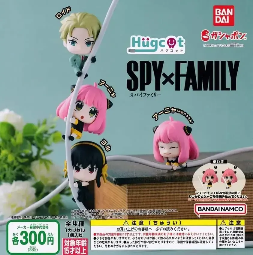 ☆ Artículo: Set de 4 mini figuras originales de SPY x FAMILY: Hugcot, marca Bandai, serie Gachapon (Toy Capsule). Protegen los cables, cargadores y audífonos de desgaste y quiebre.